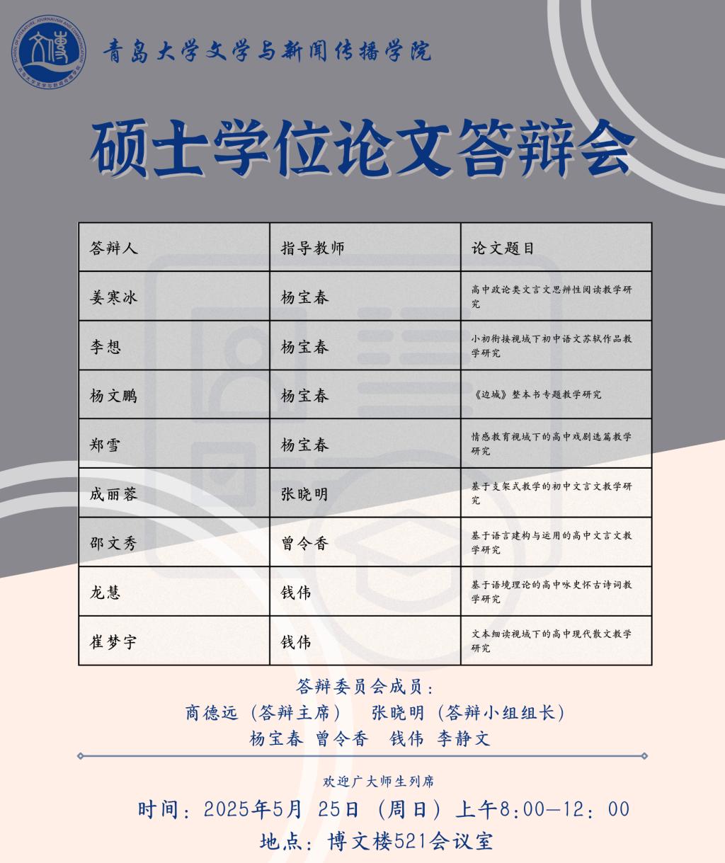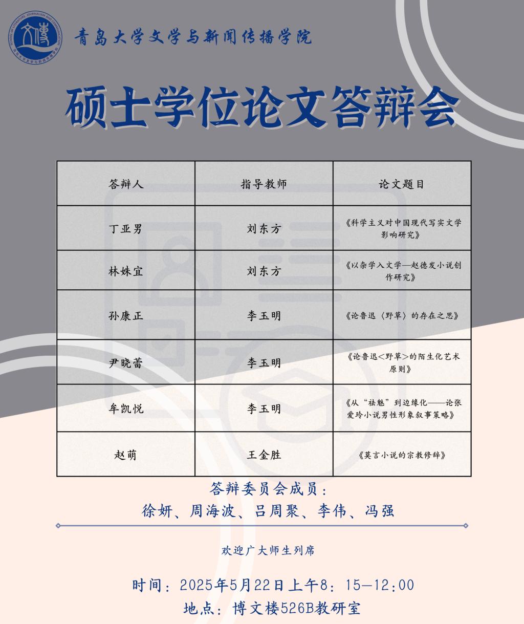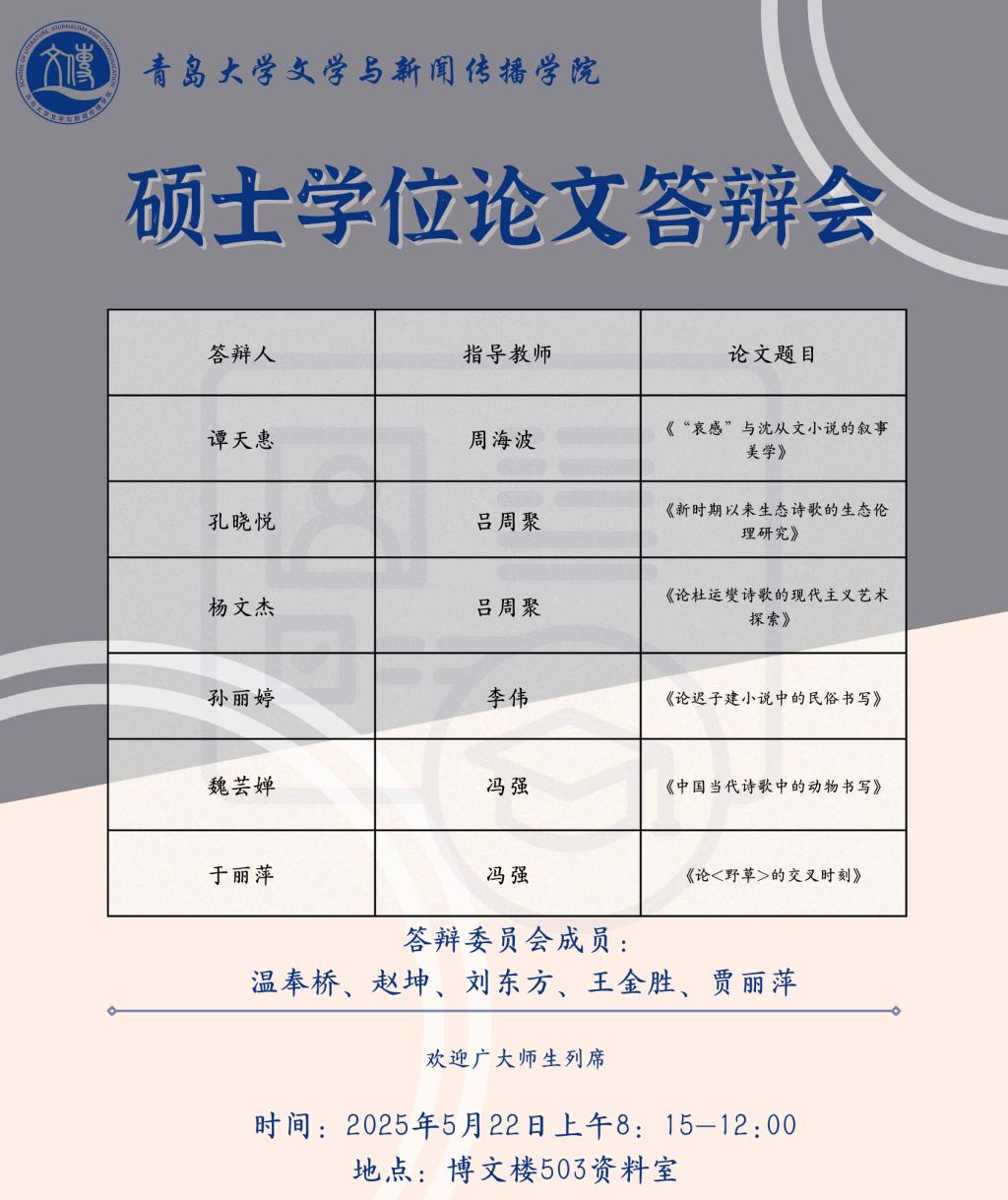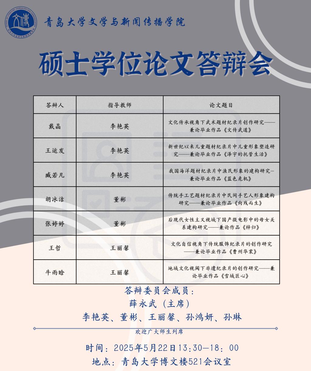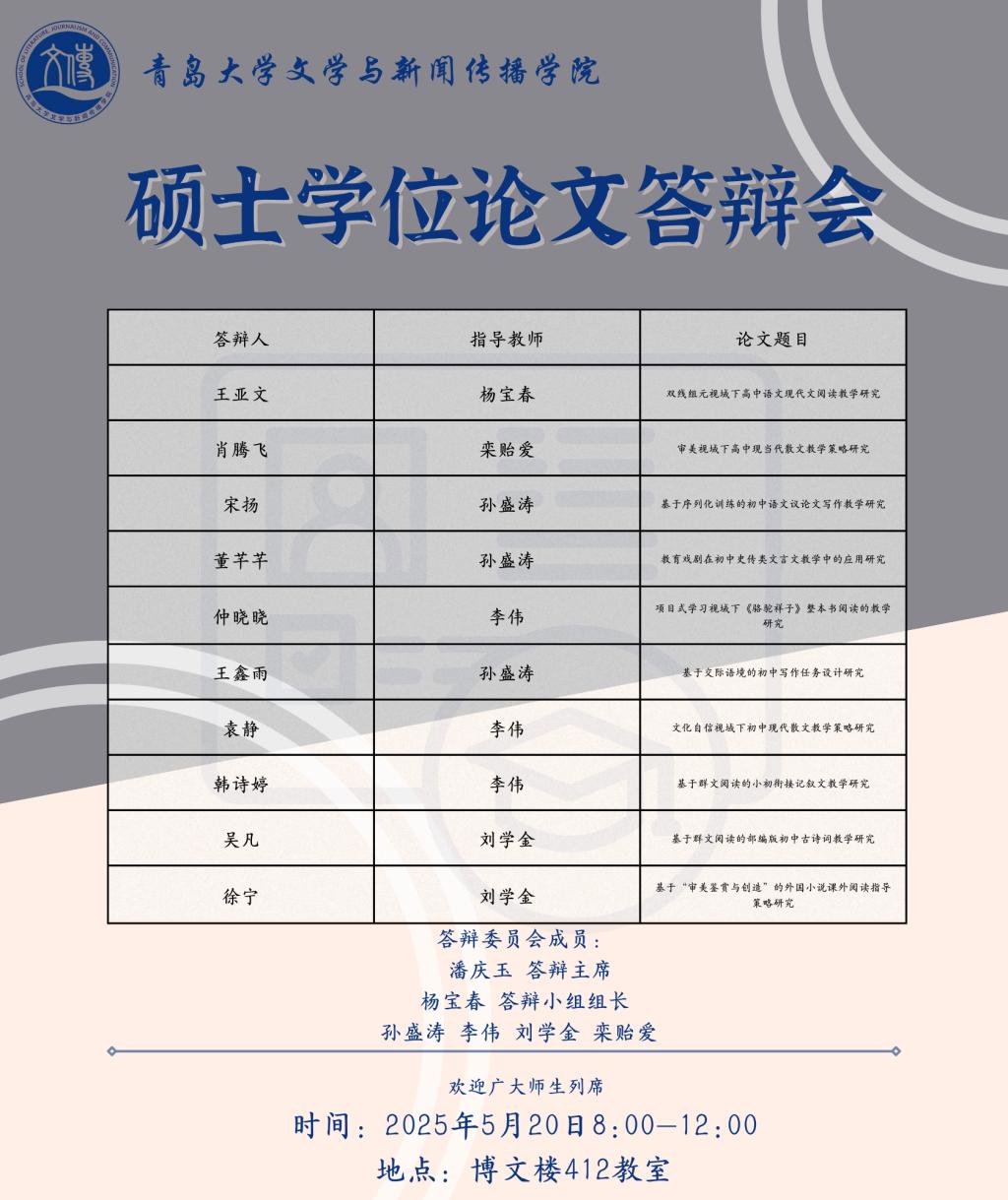 草莓视频-草莓视频app下载 将于5月19日至5月25日进行文艺学、汉语言文字学、中国古典文献学、中国古代文学、中国现当代文学、比较文学与世界文学、新闻与传播、学科语文(全日制)、学科语文(非全日制)、广播电视专业的硕士学位论文答辩,欢迎广大师生列席旁听。具体安排如下: